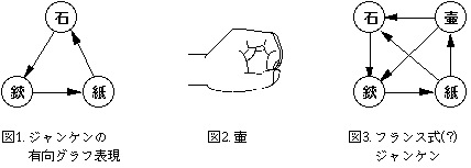 ジャンケンには石、紙、鋏の3つの手があり、石は鋏に勝ち、鋏は紙に勝ち、紙は石に勝つ。この関係は石、紙、鋏といった手を節点に対応させ、節点xに対応する手が節点yに対応する手に勝つときに有向枝(x,y)を持つような有向グラフによって一意に表わすことができる(図1参照)。噂ではフランスにはこの、石、紙、鋏に壷(図2参照)という手を加えた4手のジャンケンがあるらしい。これを有向グラフで表わせば図3になる。この様に、ジャンケンを拡張して考えると、様々な有向グラフに対して、対応するジャンケンが存在することになる。